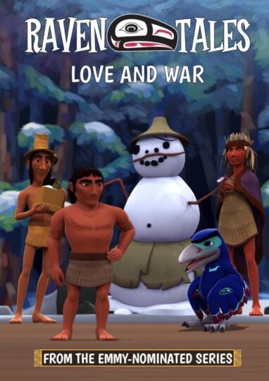 Join Raven, Eagle and Frog and their new friends the first people in the land before time. Raven Tales: Love and War is the fifth episode in this series of animated television programs based upon the multiple award-winning animated film, Raven Tales: How Raven Stole the Sun, and celebrating the First Nations’ folklore of the Northwest coast. Raven Tales chronicles the wild and wacky adventures of Raven, the most powerful and trickiest trouble-maker of First Nations’ folklore. In this episode, Qos asks Raven (Dr. Evan Adams, Smoke Signals) to help him win the heart of Igis, a young woman who is too vain to love anyone but herself. Raven asks Qos to collect the snow from Igis’ footprints, a tuft of her hair and some of her old clothes to build a snow man. With a puff of his breath, Raven brings the snowman to life and names him Moowis, telling Qos that it will teach Igis the true meaning of Love. But Qos is shocked when Igis falls in love with Moowis instead!